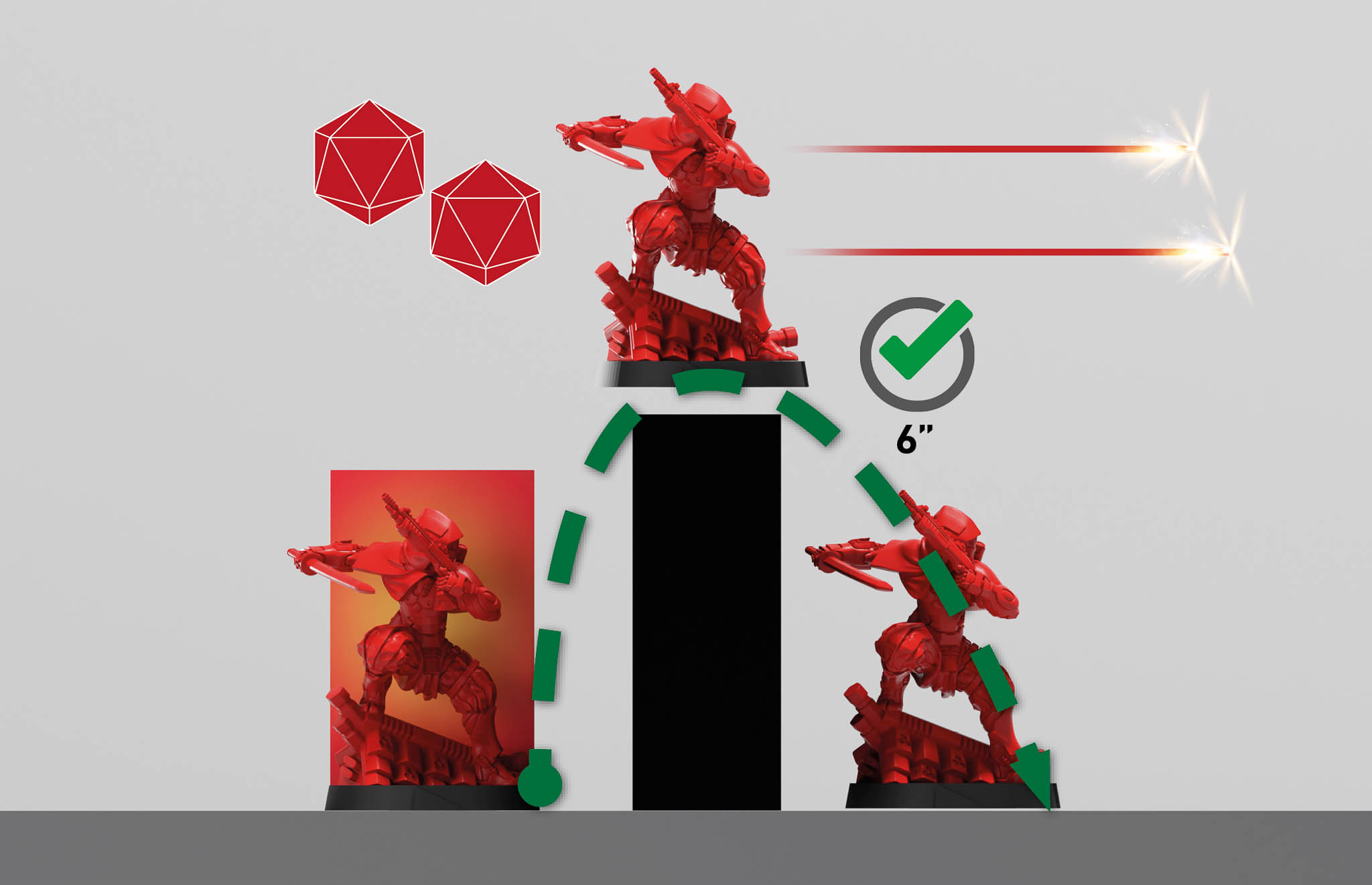 In his Active Turn, a Trooper with Super-Jump wants to Attack an enemy Trooper, but without leaving themselves exposed in the next Order. In addition, an obstacle is blocking his LoF. So, he decides to use his Super-Jump (Jet Propulsion) Special Skill to perform a diagonal Jump, tracing a path that clears the obstacle blocking his LoF allowing him to shoot at the enemy Trooper, and then chooses to return back to the starting position of his Jump.
